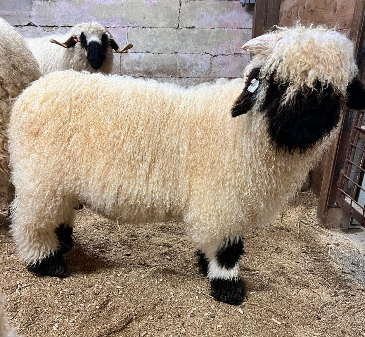 Maeve, our darling lamb that just wow'd us from the moment she entered the world. She is an excellent example of the breed: show-ready, genetically elite, and with outstanding potential as a foundation female. Powerful presentation and balanced conformation with the confident presence expected of top-quality Valais Blacknose. Her bold, symmetrical markings look perfectly painted on her dense bright white fleece.