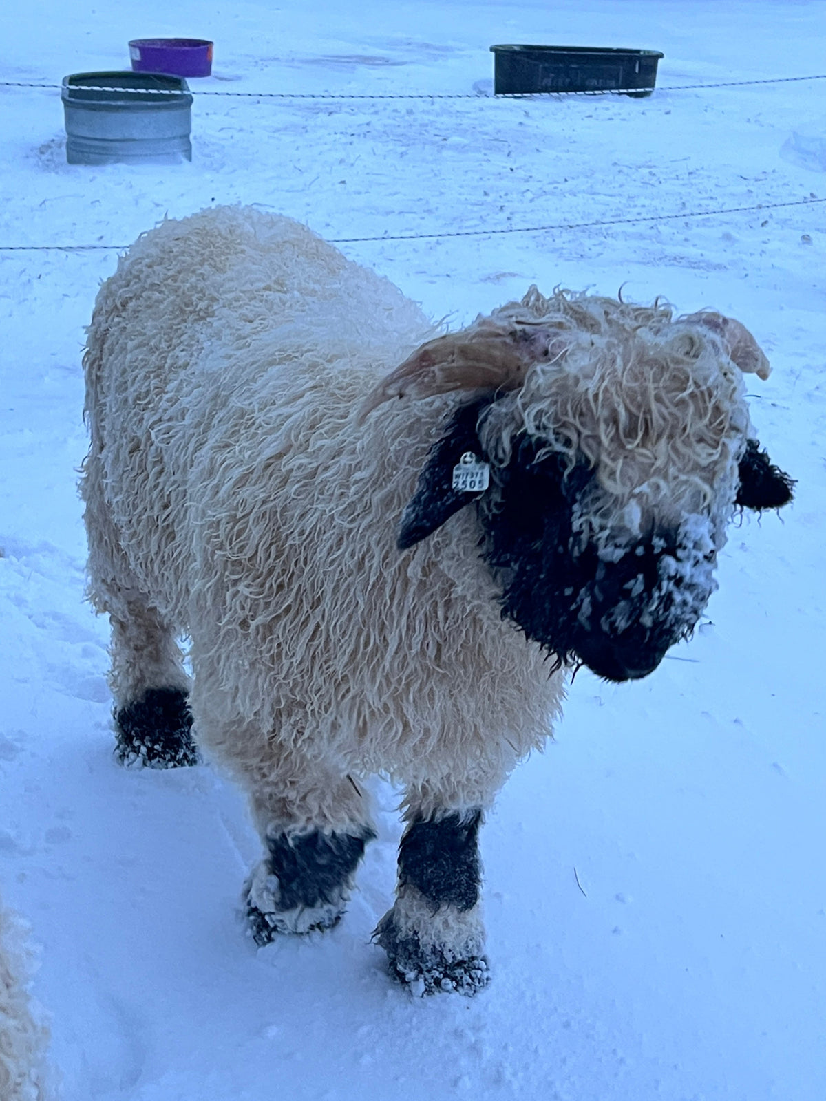 Greta's quality was recognized on the national stage stage when took home a blue ribbon and Swiss bell at the USA National Valais Blacknose Sheep Show in 2024. The year prior her half sister of her Sire Bojangles "Iowa Koala" was awarded Maximum Points at the same show.